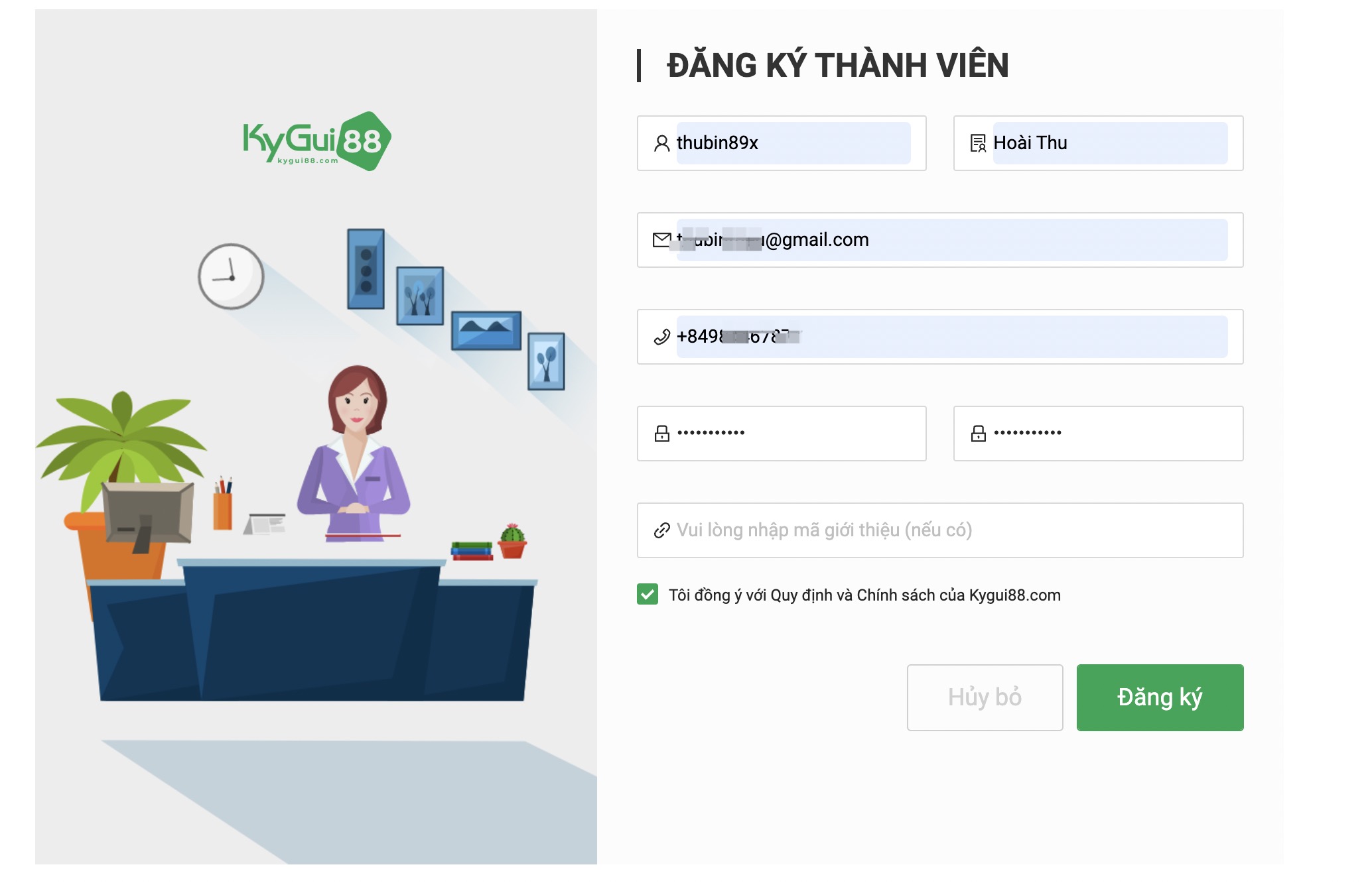 Bước 3: Click chọn Tôi đồng ý với Quy định và Chính sách của Kygui88.com